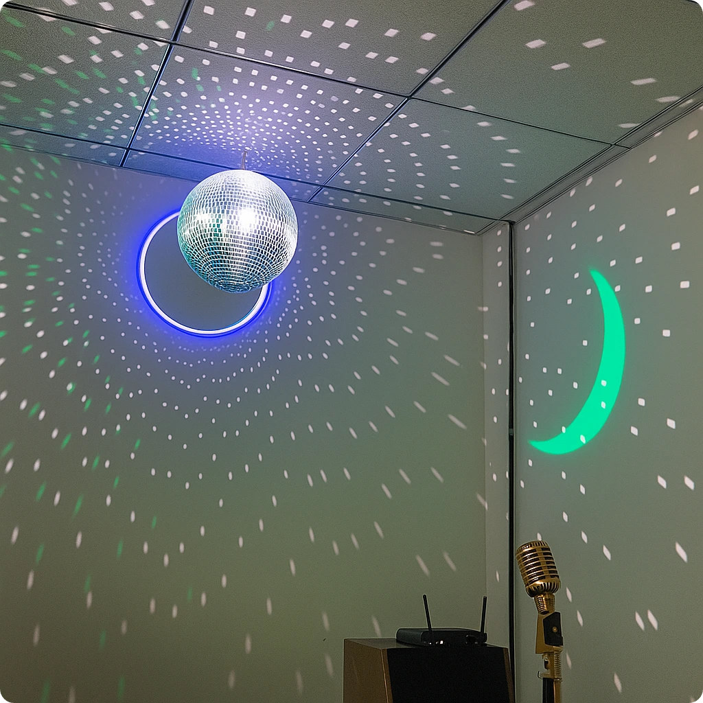 L’effet est vraiment superbe une fois les lumières allumées : les deux boules à facettes renvoient des points lumineux partout sur les murs et créent une ambiance totalement immersive. Le rendu violet donne encore plus de charme, et l’ensemble fonctionne parfaitement dans la pièce. Je suis vraiment ravi de l’atmosphère que ça apporte, c’est exactement ce que je recherchais.